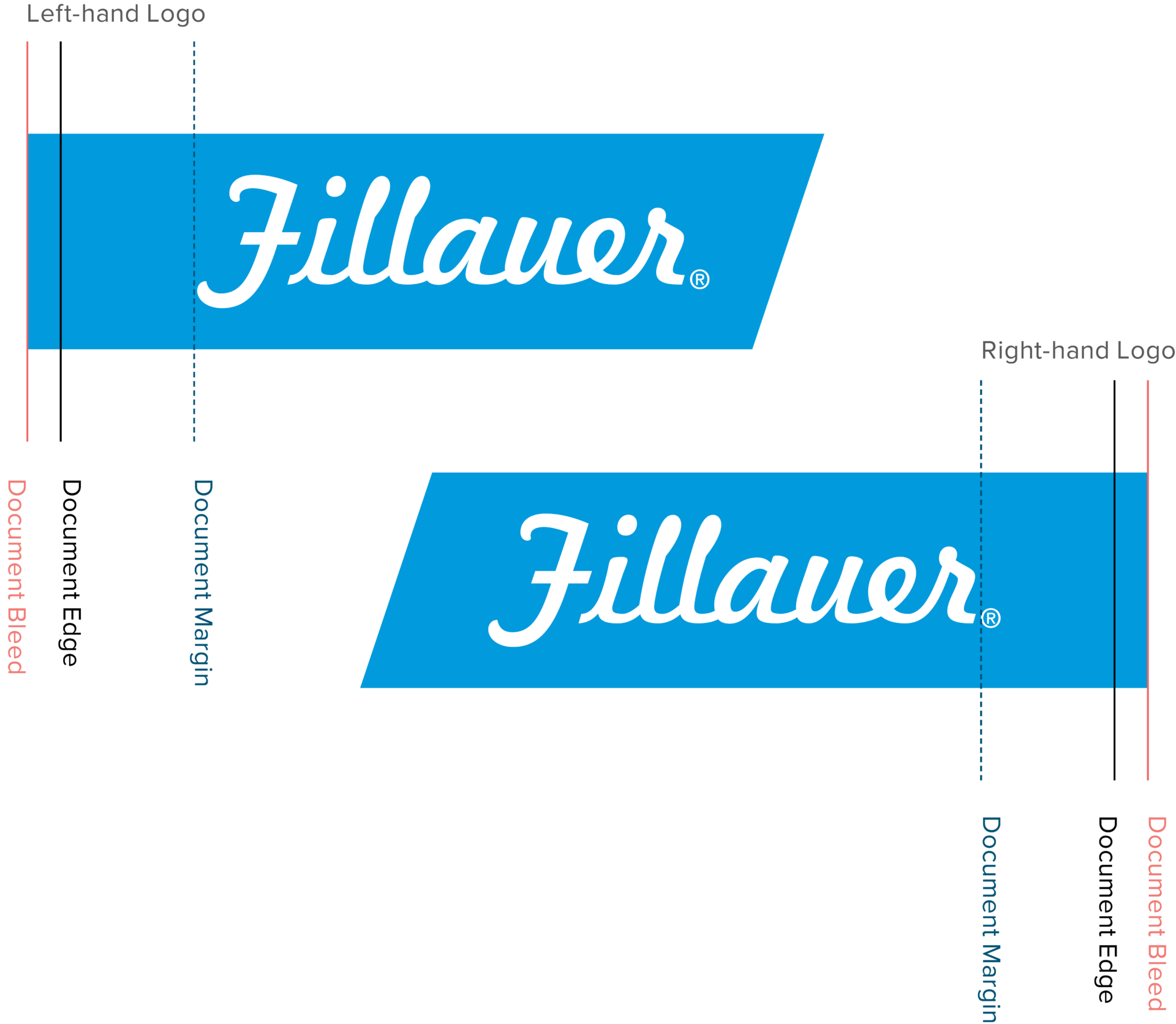 An angled box is a common way to contain the Fillauer logo in advertising materials. This helps set it apart from busy photos or backgrounds. The box should bleed off the page and the logo element should sit at the document margin. There are options for the left or right side of the page.